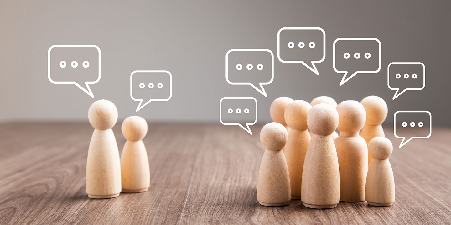 Mehrere Holzfiguren mit Sprechblasen in einer Diskussion